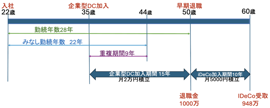 通常、確定拠出年金(企業型DC、iDeCo)の退職所得控除額を計算する際、拠出期間が勤続年数と重複していると、その分は控除枠から差し引かれます。本例では退職した50歳までの「35歳〜50歳」の15年間が本来の重複期間です。